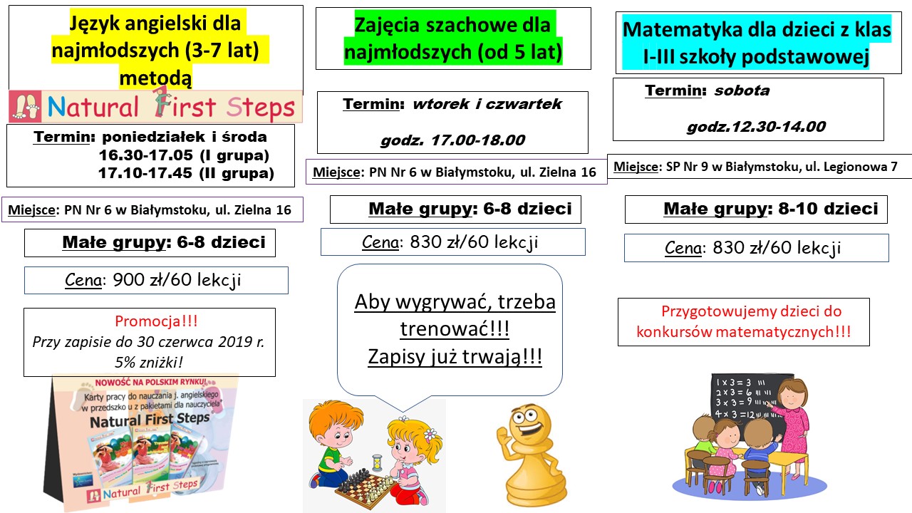 Zapisy prowadzone będą do 30.08. na http://www.chessarbiter.com/turnieje/2019/ti_4693/registration_form.html?l=pl lub pod nr tel. 505181685. Nagroda główna: karnet na wybrane zajęcia organizowane przez Kuźnię Talentów w roku szkolnym 2019/2020. Puchary i medale dla najlepszych uczestników turnieju, nagrody i upominki, a także pamiątkowe dyplomy dla wszystkich zawodników. Polecamy przyniesienie koca i przekąsek w celu urządzenia sobie pikniku na świeżym powietrzu w trakcie trwania turnieju. Dobra zabawa gwarantowana! Do zobaczenia ![]()